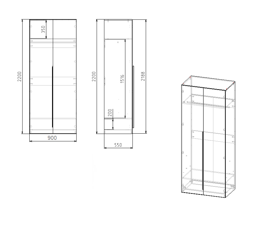 Внутри шкафа расположены большая штанга, верхняя и нижняя полки.
