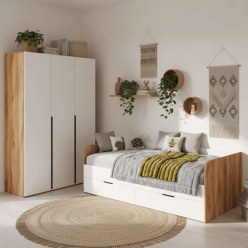 Натуральный декор дуб золотистый с выразительными полосами и следами от сучков прекрасно сочетается с однотонным белоснежным декором.