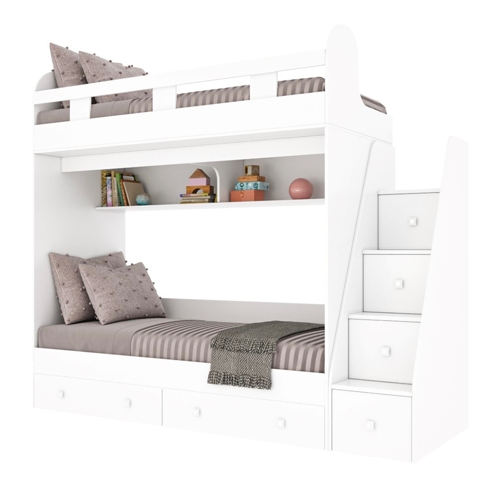 Прочная двухъярусная кровать Юниор-2 с удобной лестницей, безопасным высоким бортиком и ящиками для хранения.