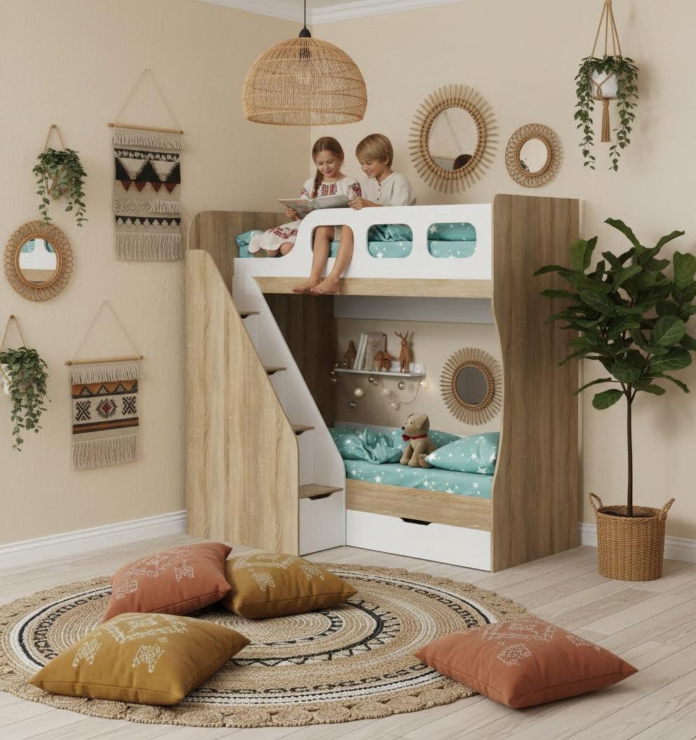 * В нижнюю кровать встроен выдвижной ящик для белья и игрушек.