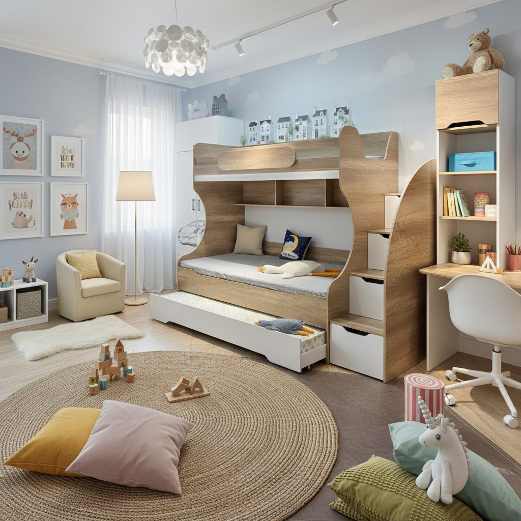 Увеличенное, просторное нижнее спальное место позволяет комфортно разместиться ребенку вместе со взрослым.