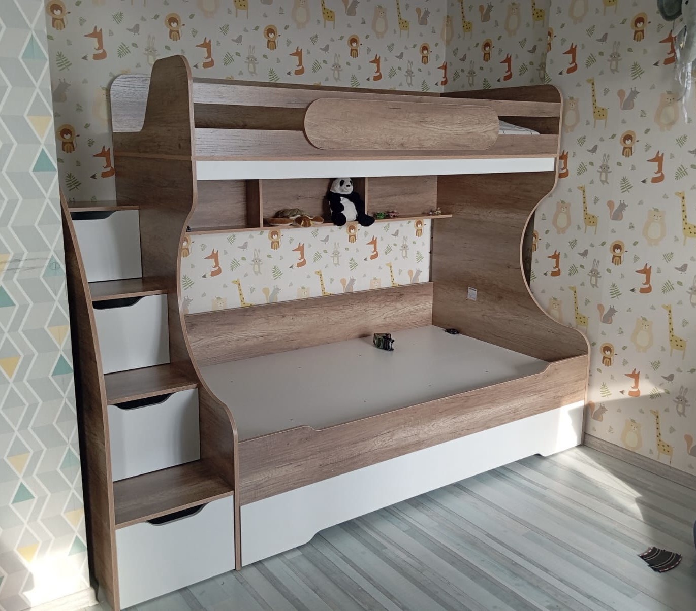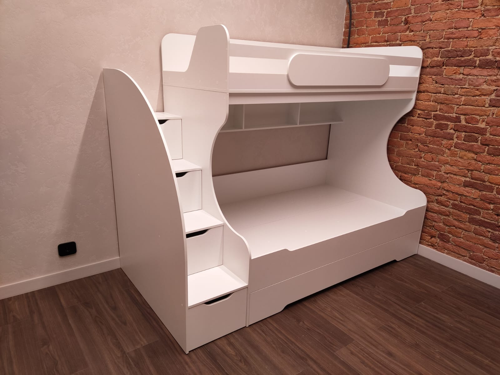 Вместо них - цельный и прочный настил из ЛДСП, который выдерживает сверхвысокую нагрузку и позволяет расположиться даже взрослому с ребенком.