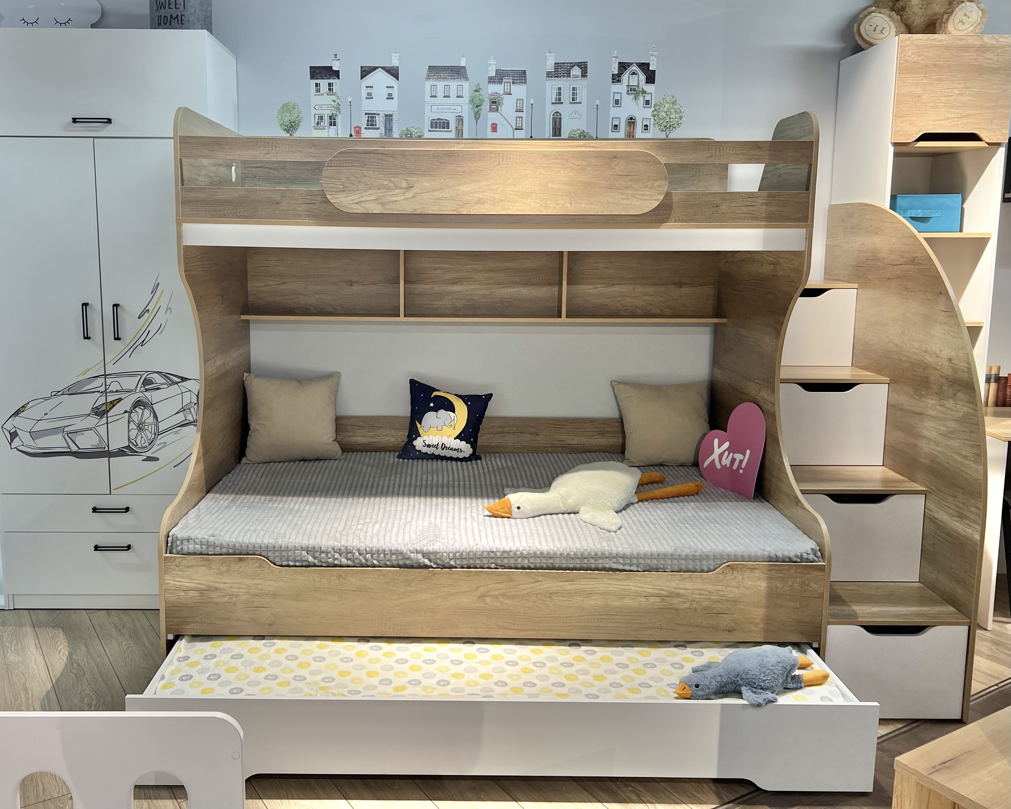 * В лестницу встроены выдвижные ящики для игрушек.