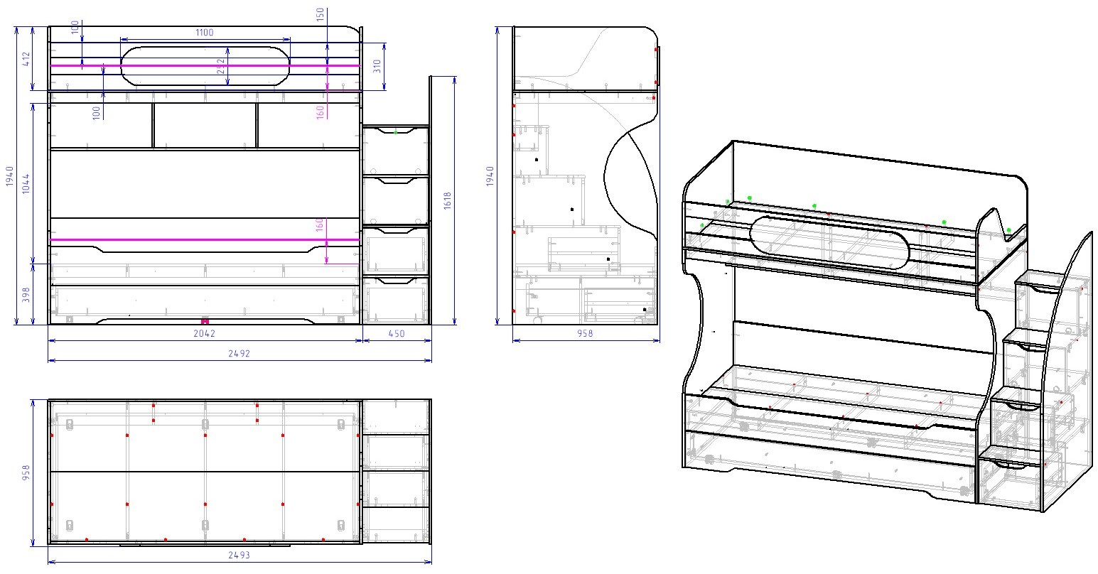 Габариты кровати: ширина 2493, глубина 958, высота 1940 мм