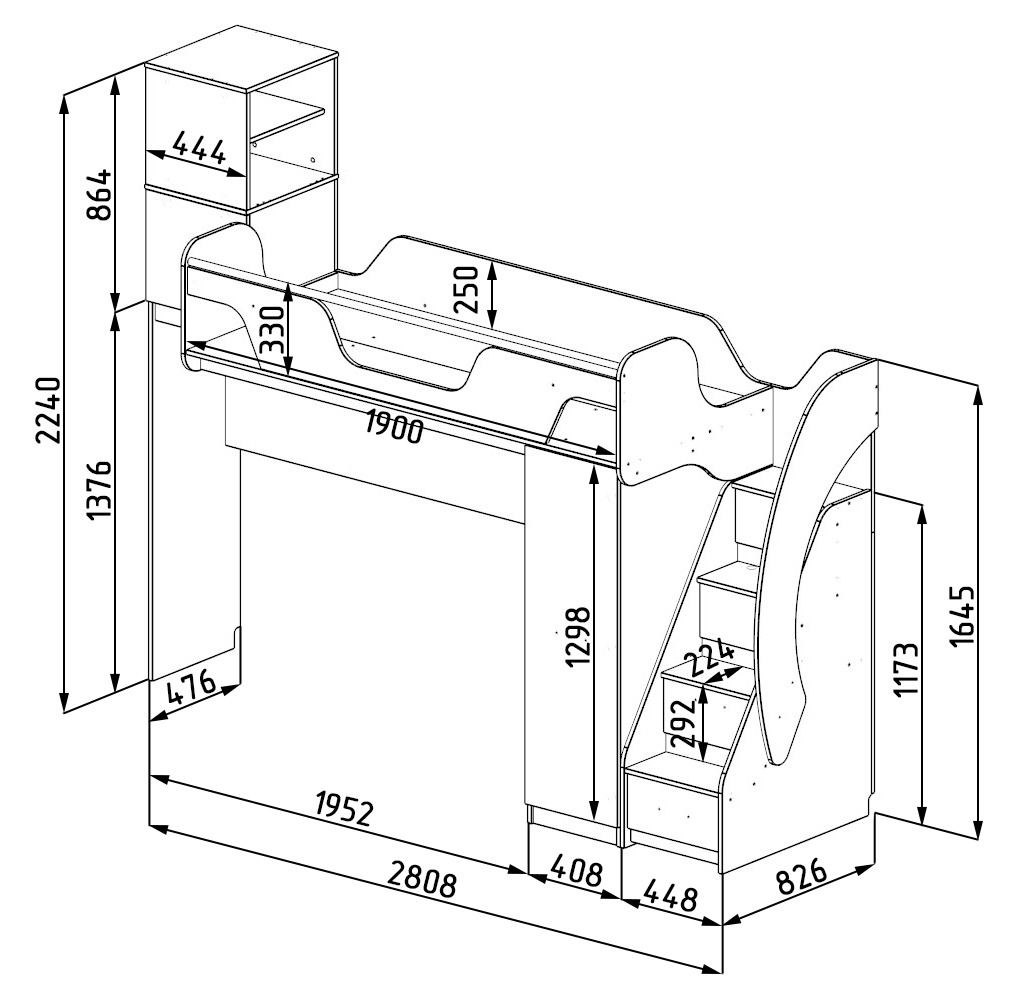 Габариты кровати: высота 2240 х глубина 826 х ширина 2808 мм