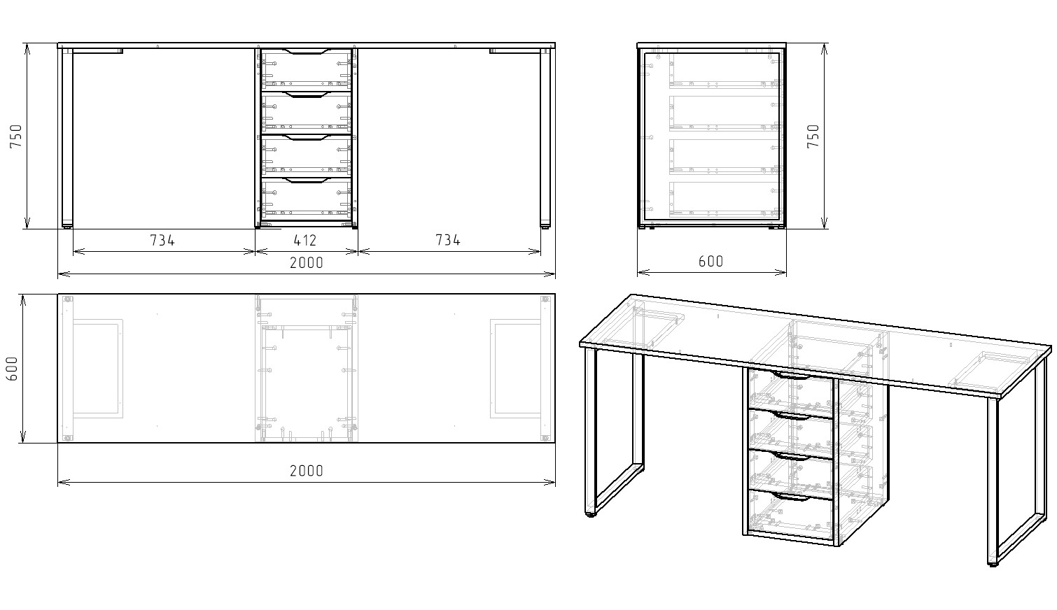 Габариты стола: ширина 2000 х высота 750 х глубина 600 мм