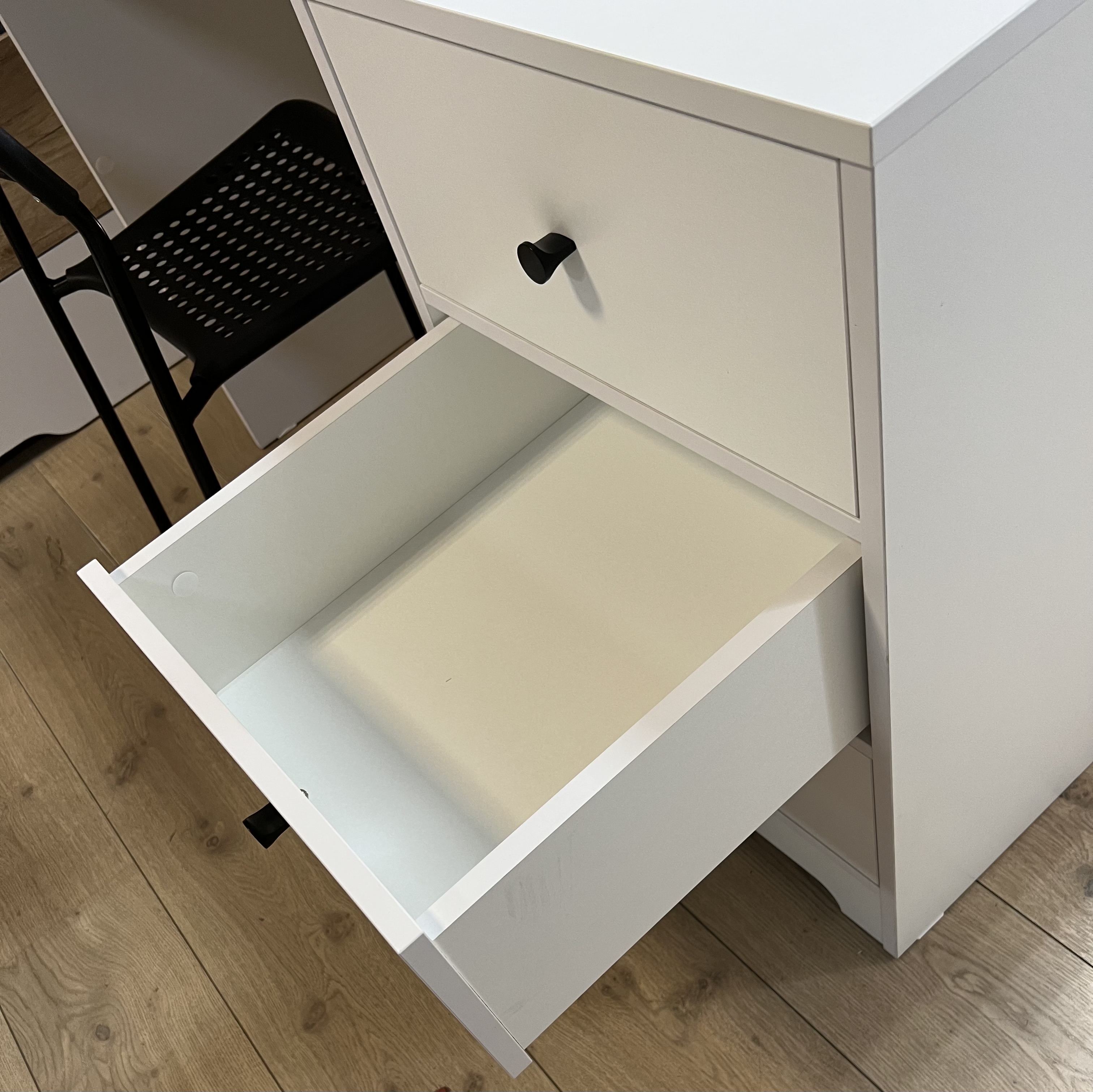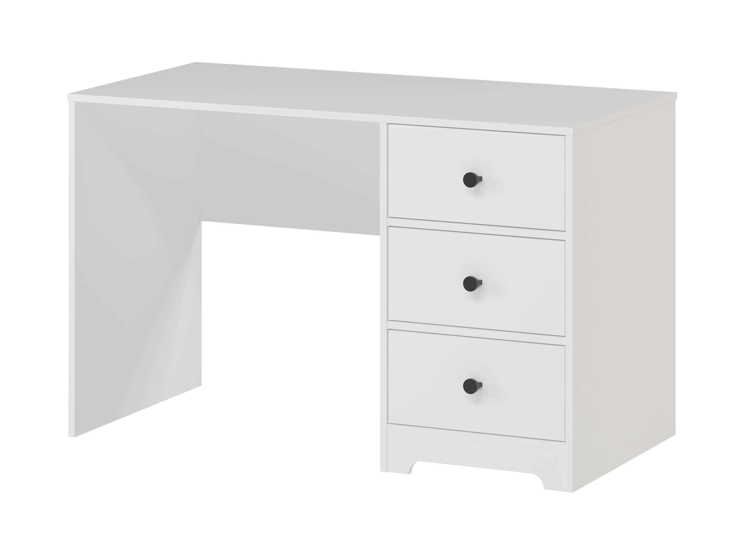 В стол встроены три выдвижных ящика на направляющих скрытого монтажа с доводчиками.