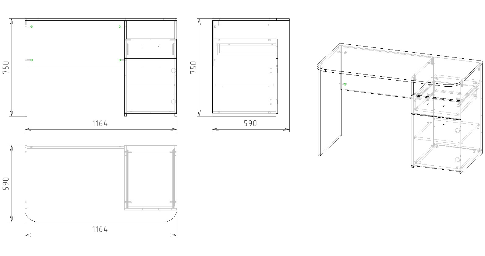 Габариты стола: ширина 1164 х высота 750 х глубина 590 мм