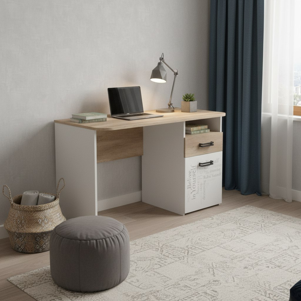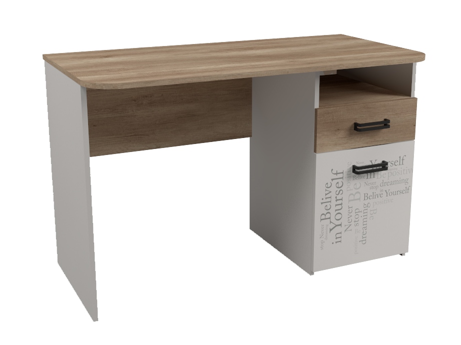 ЛДСП класса Е0,5 в сочетании цветов "дуб каньон + белый" и оформлена дизайнерским принтом.