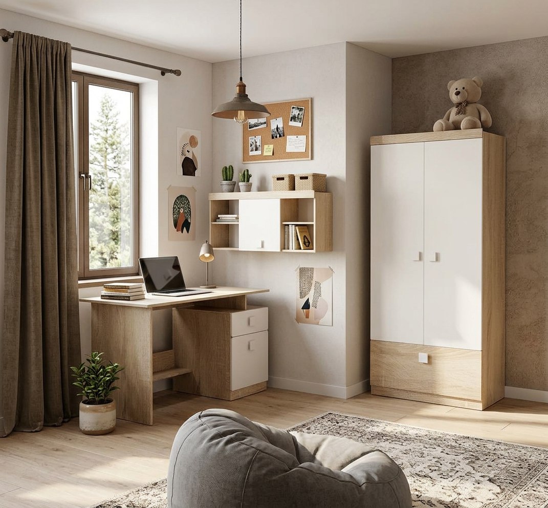 Оттенок натурального дерева "дуб сонома" дает ощущение комфорта и единения с природой, а воздушный белый цвет в интерьере работает как основа для ярких штрихов.