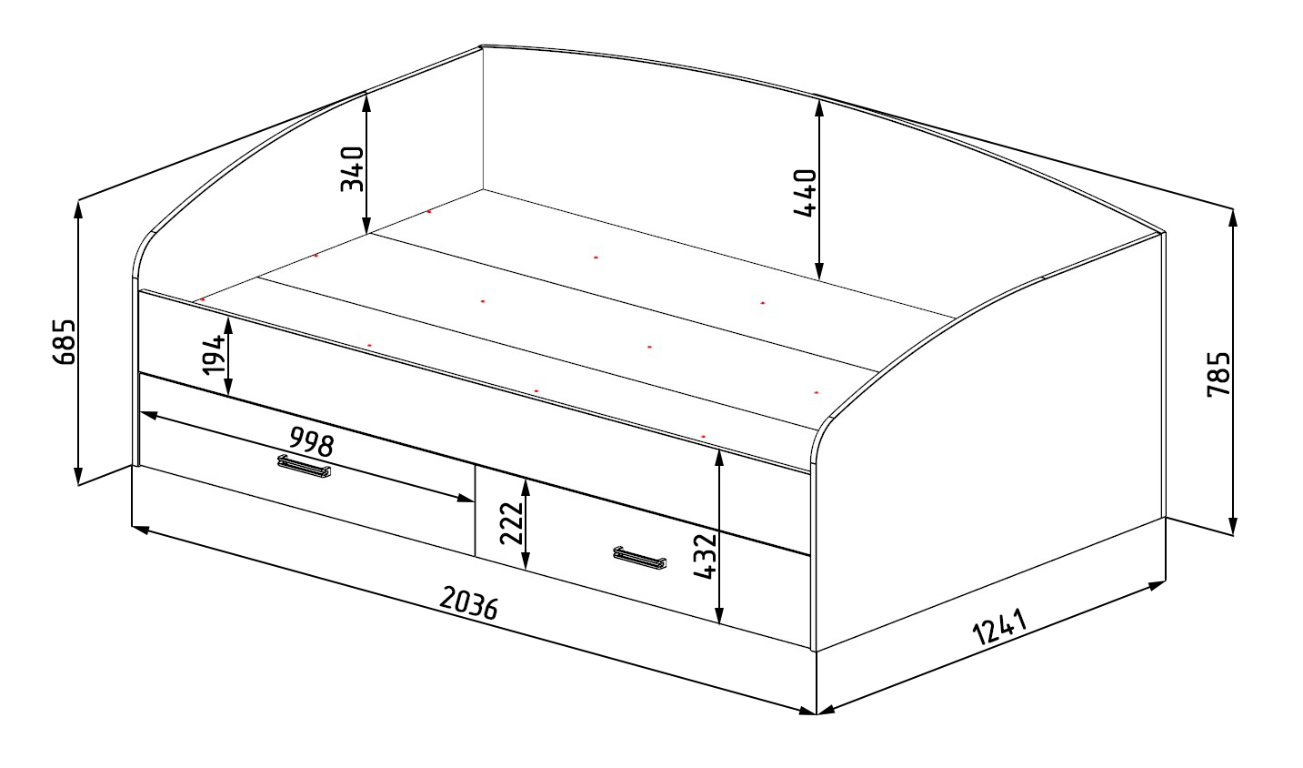 Габариты кровати: ширина 2036 х высота 690 х глубина 1240 мм