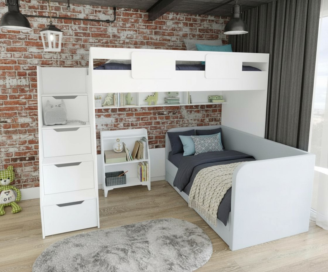 кровать-чердак Мозаика-2 + мягкая кровать Nepos + стеллаж детский Уют-5