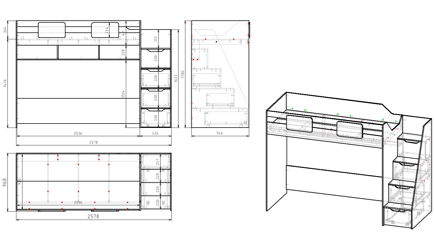 ширина с учетом лестницы 2578, глубина 968, высота 1780 мм