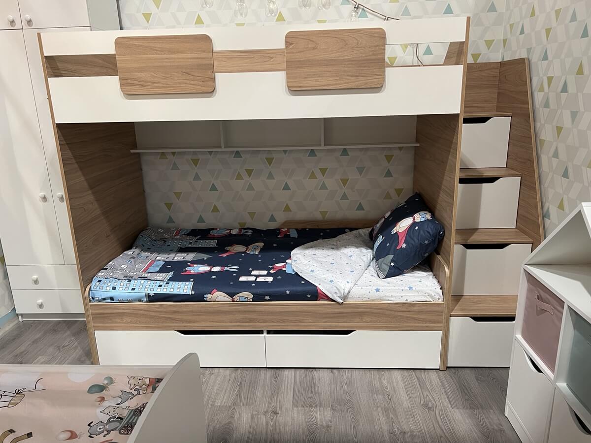 В лестницу и нижнюю кровать встроены выдвижные ящики на шариковых направляющих - удобно и практично.