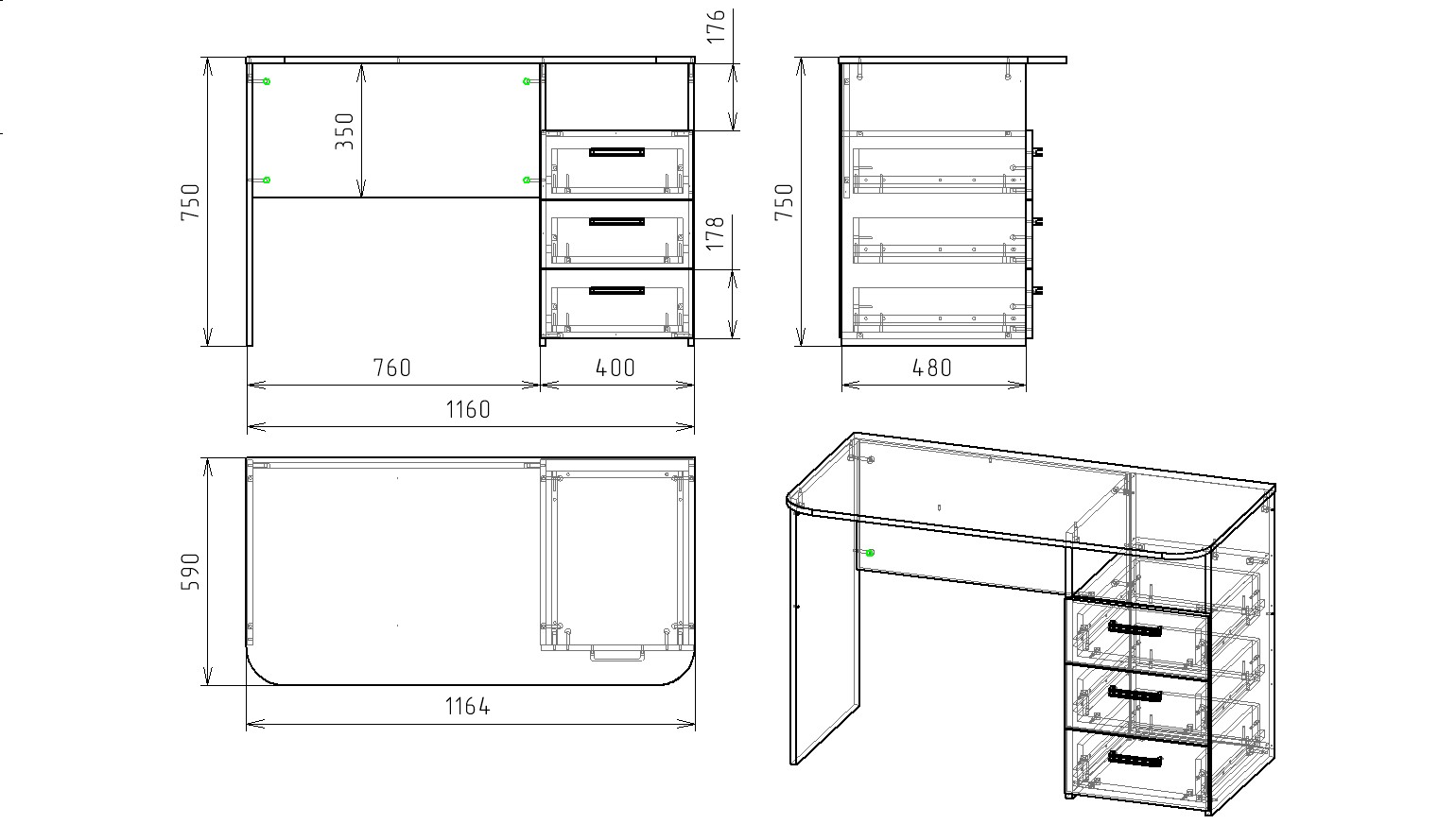 Габариты стола: ширина 1164 х высота 750 х глубина 590 мм