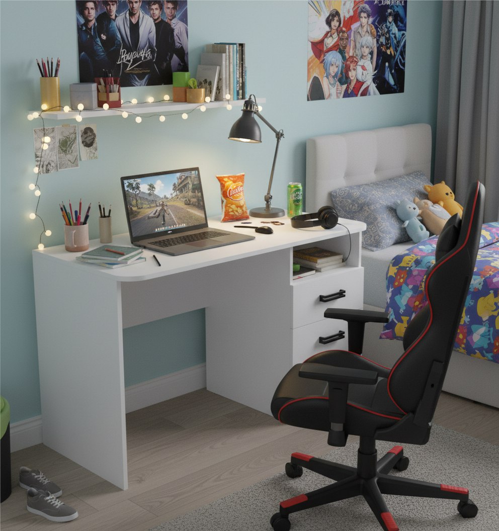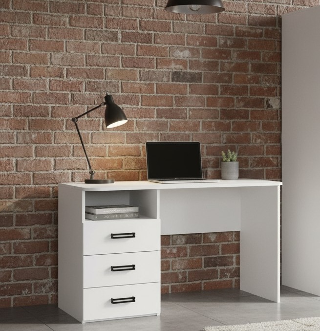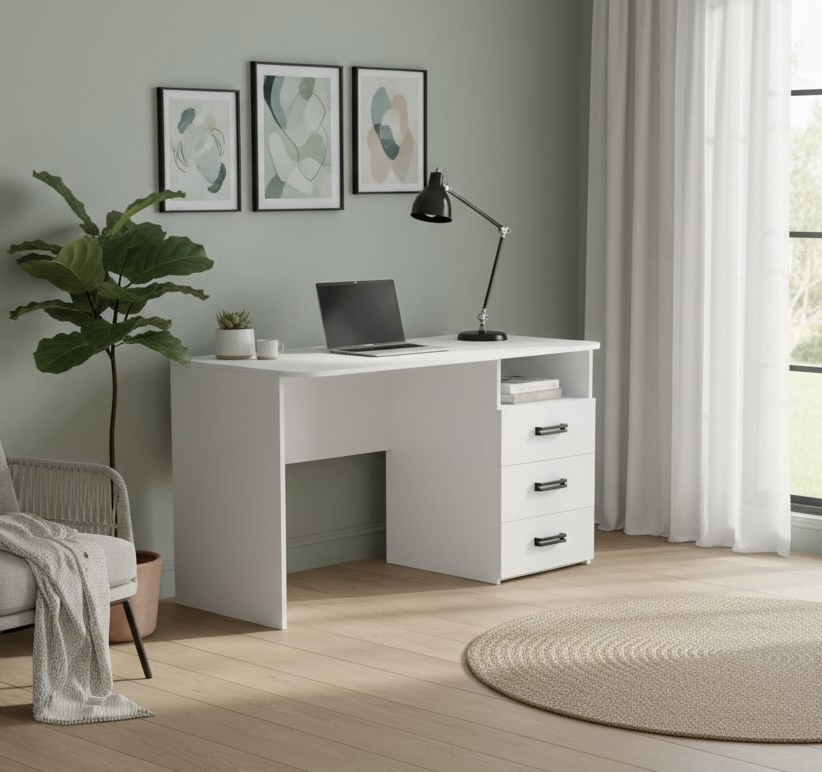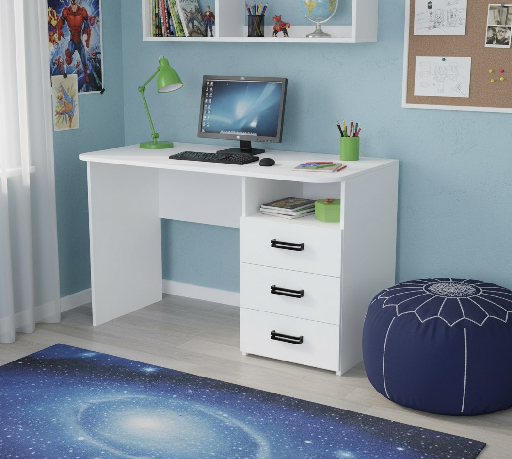 В стол встроены три выдвижных ящика на шариковых направляющих.