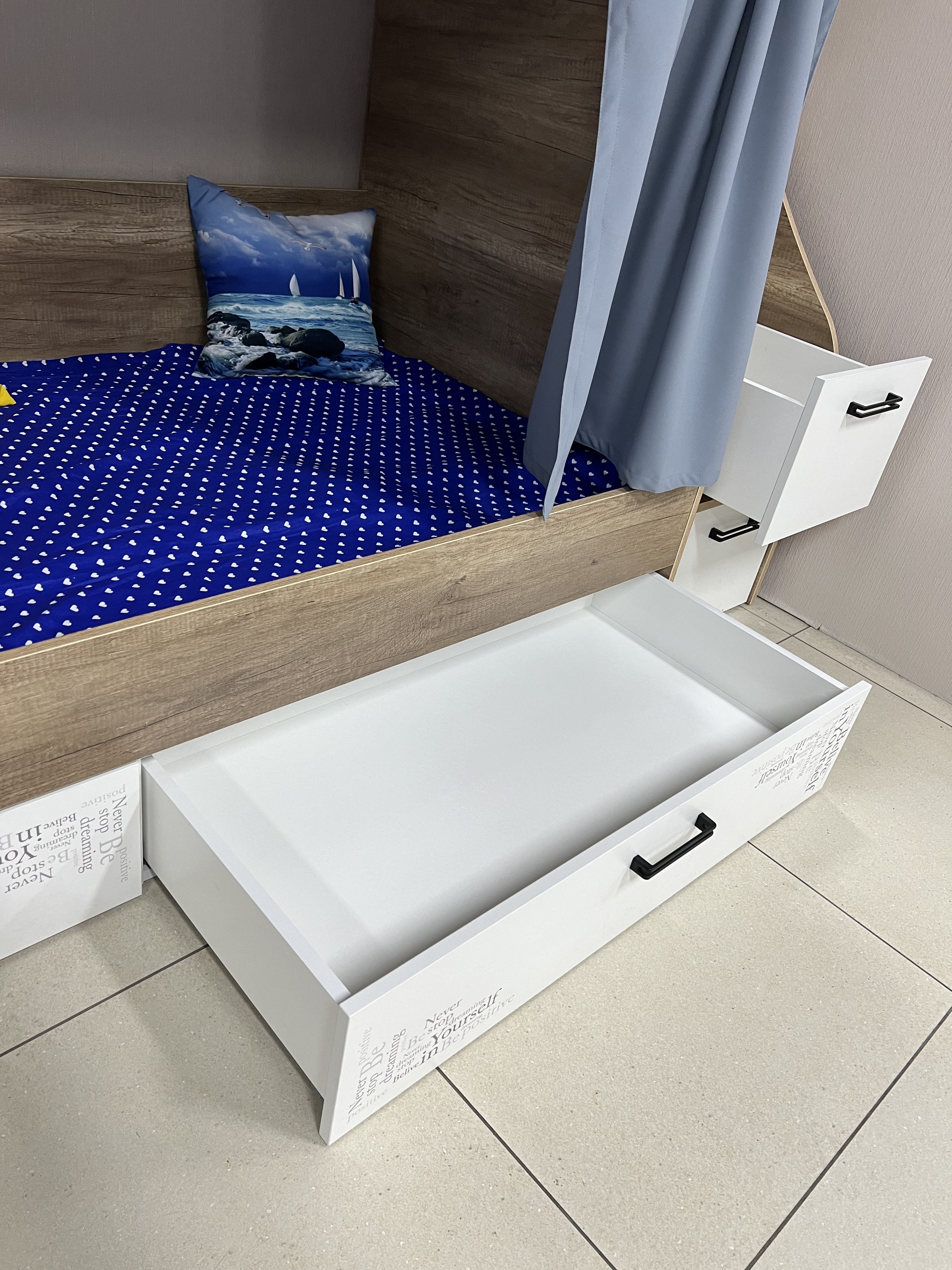 Кровать уникальна наличием лестницы-комода, в которой можно хранить как постельное белье, так и детские игрушки.