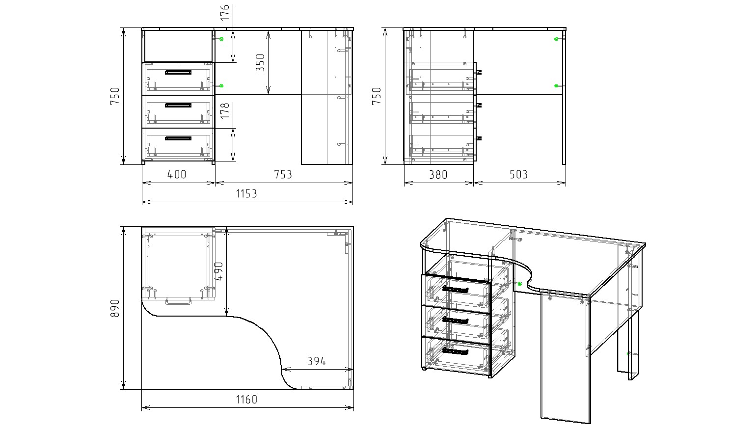 В стол встроены три выдвижных ящика на направляющих скрытого монтажа.