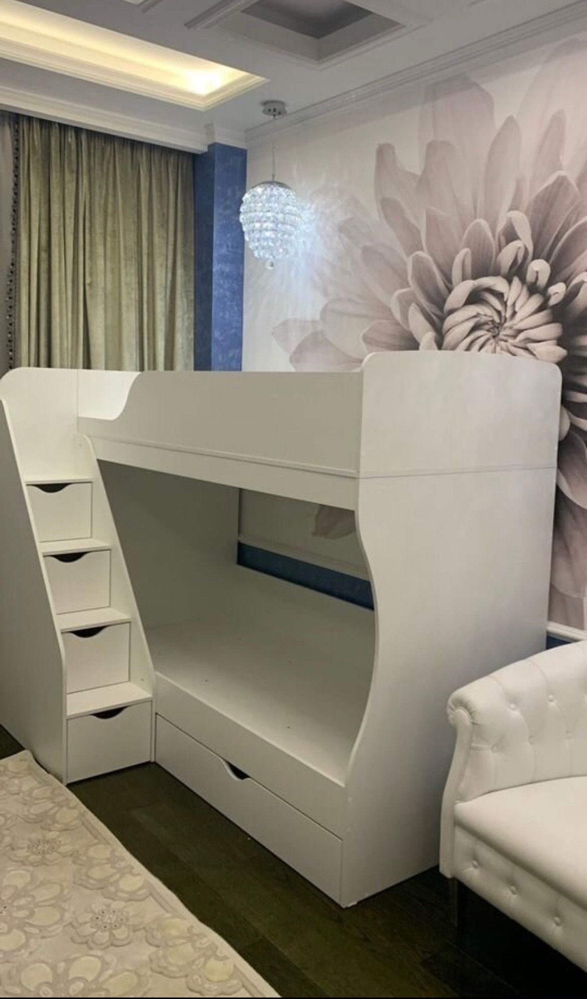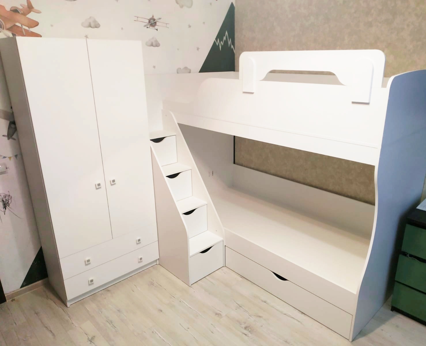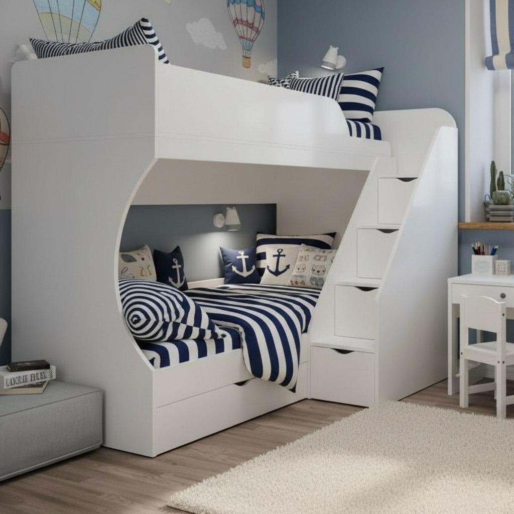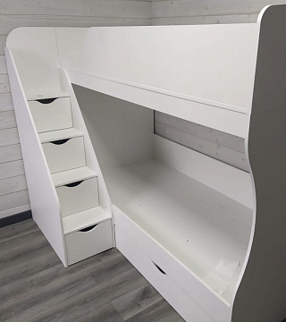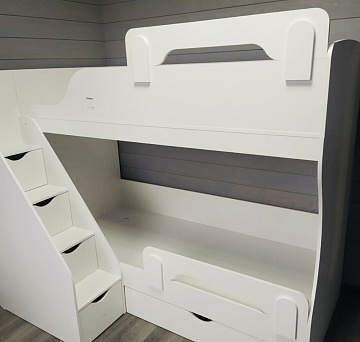 Высокая нагрузка на спальные места. Удобная лестница с ящиками. Высокий безопасный борт |