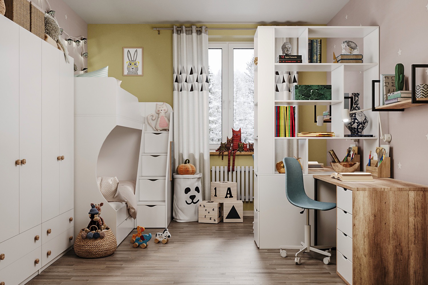 В нижнюю кровать встроен выдвижной ящик для белья и игрушек.