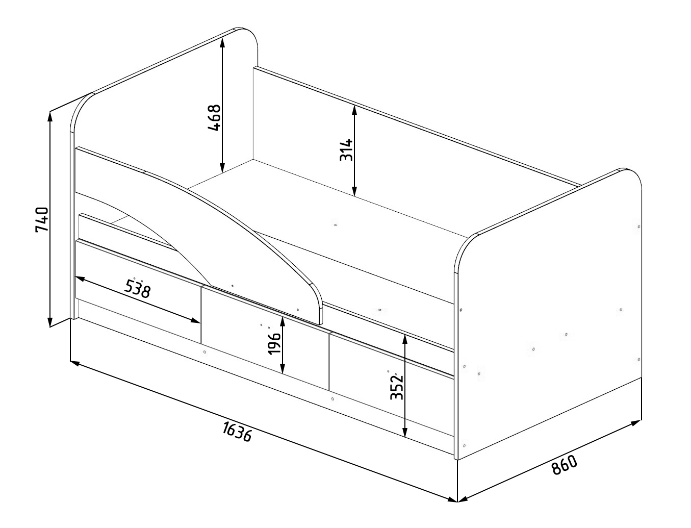 Габариты кровати: ширина 1636 х высота 740 х глубина 860 мм