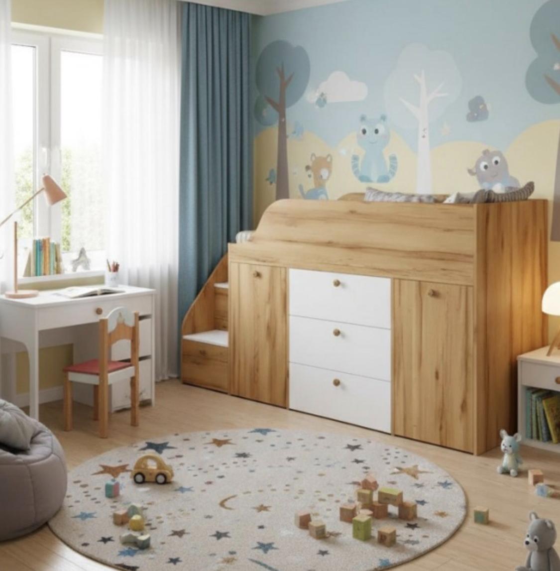 Функциональная кровать с удобной лестницей и множеством мест для хранения детских вещей.