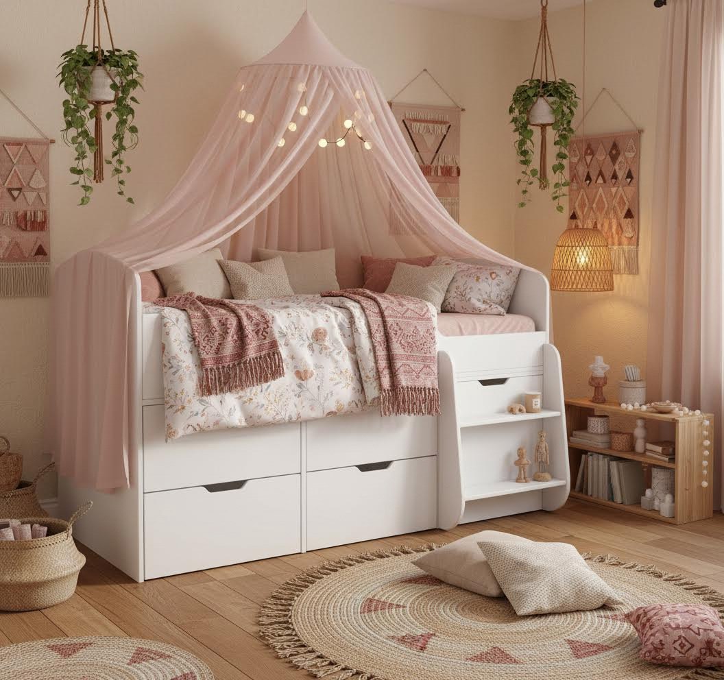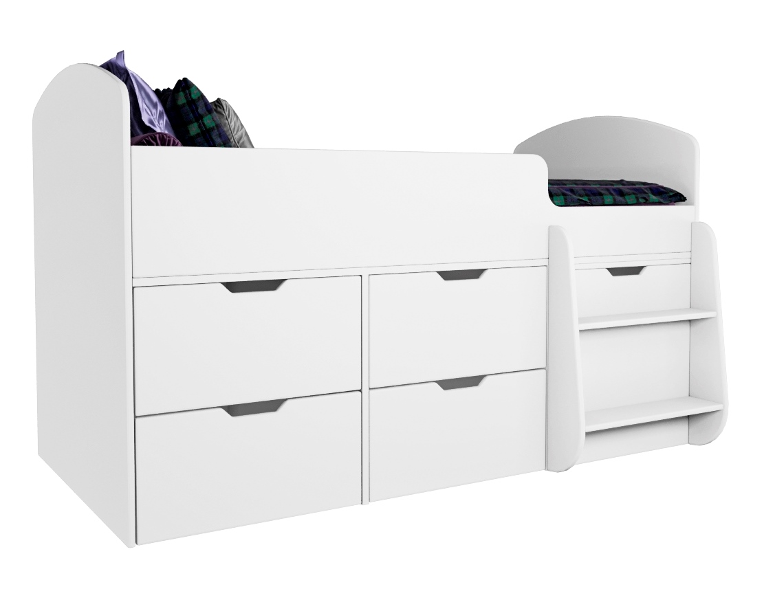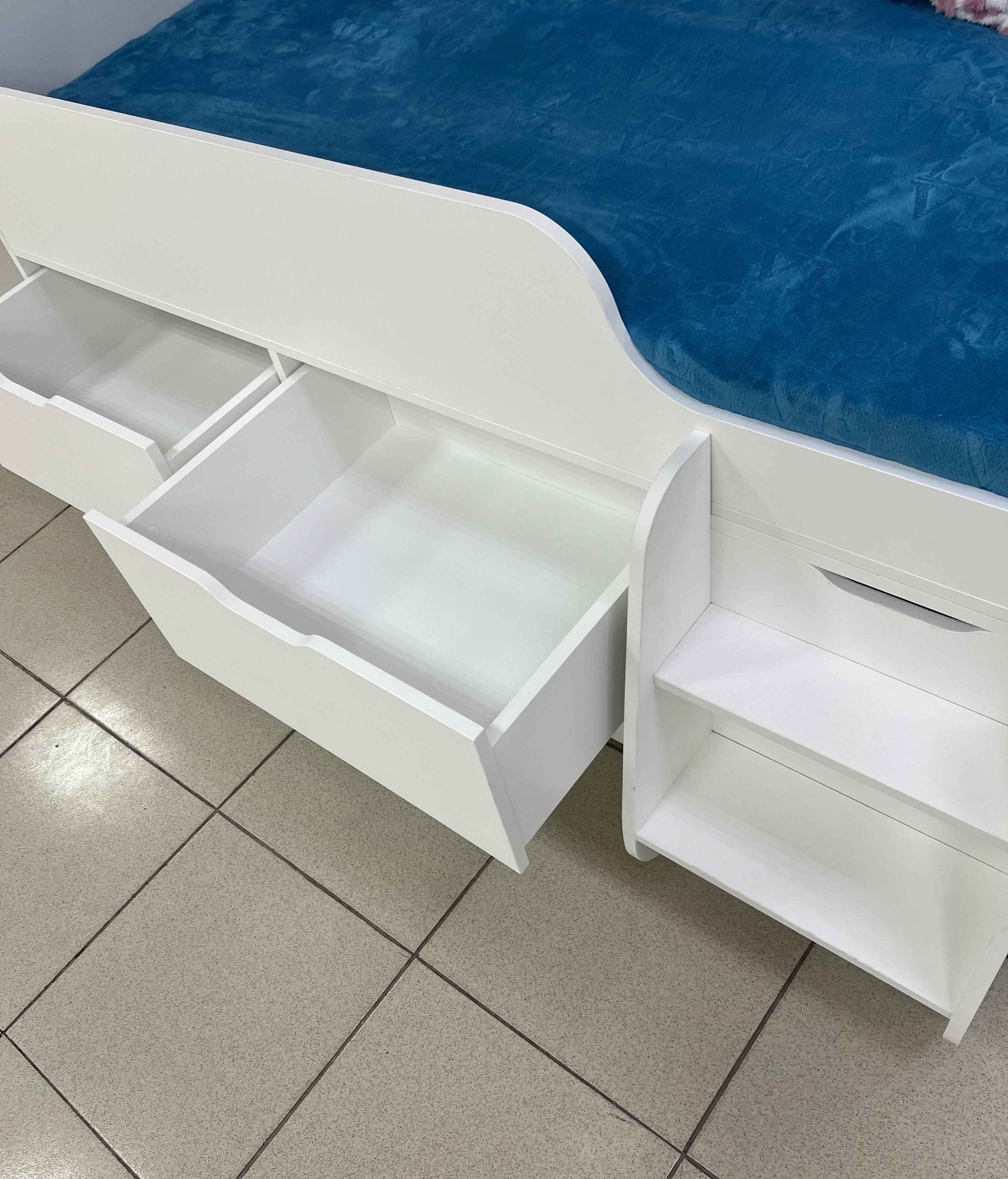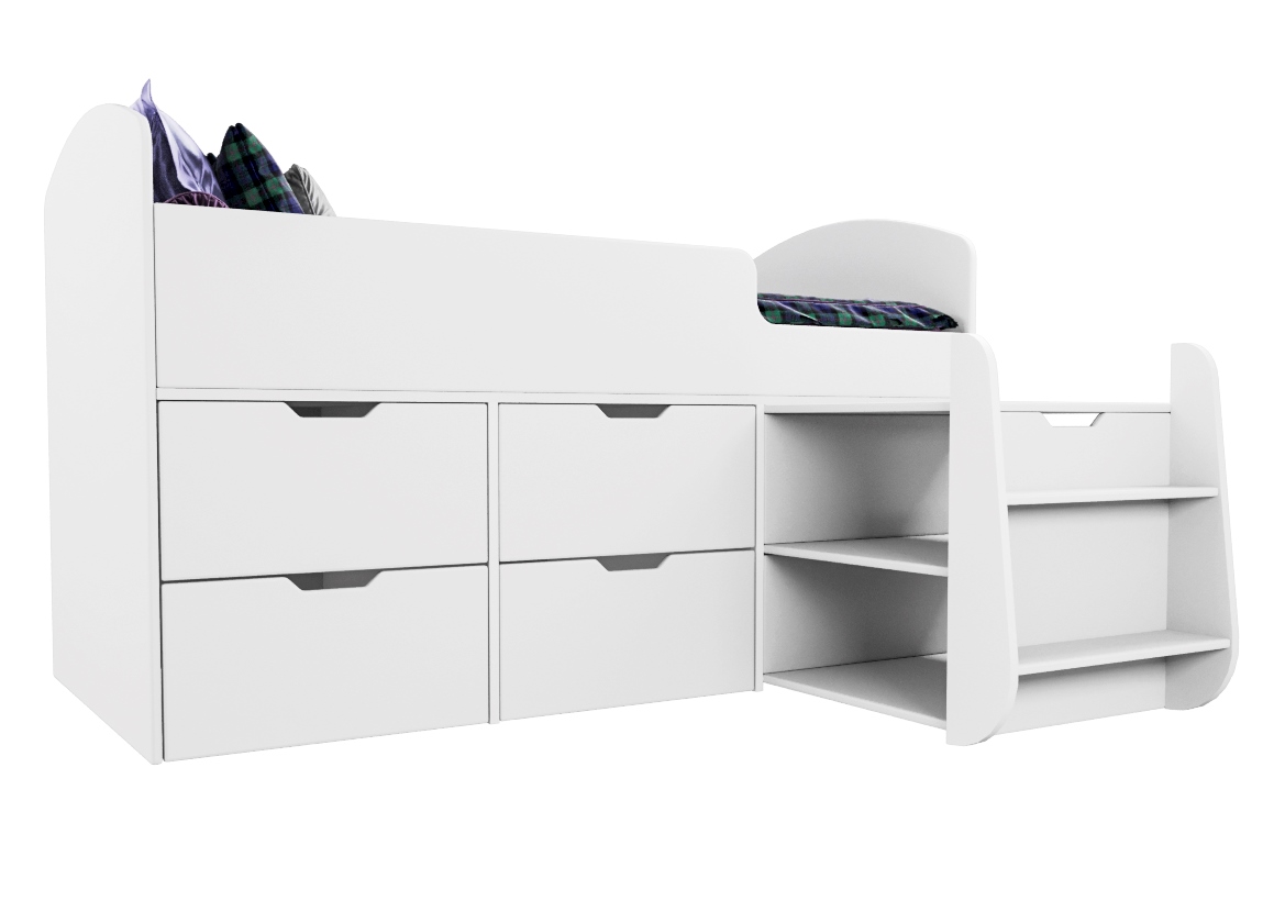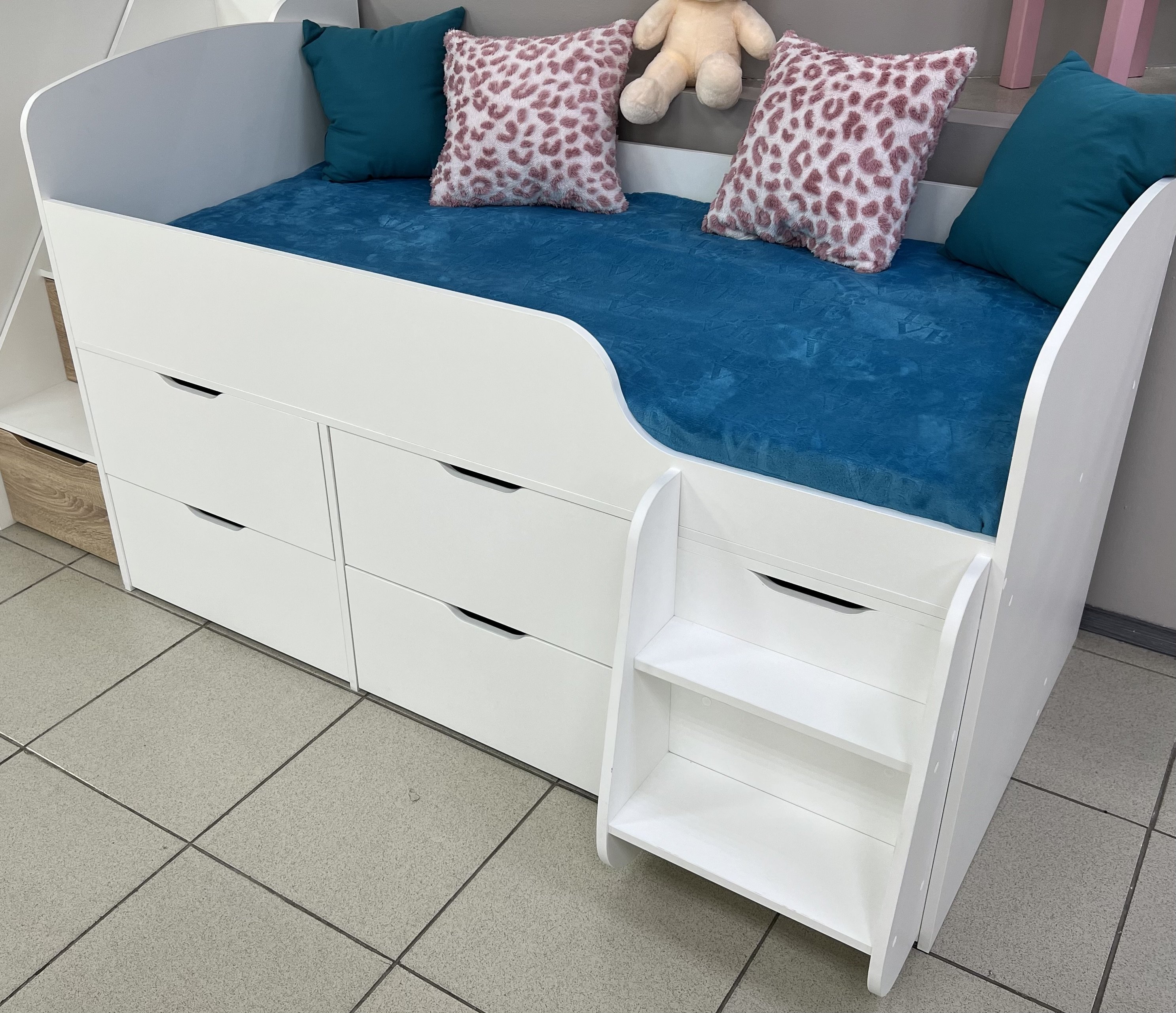 Безопасный, высокий бортик, удобная выдвижная лестница с внутренними полочками и небольшая высота кровати сделаны специально для детей младшего возраста.