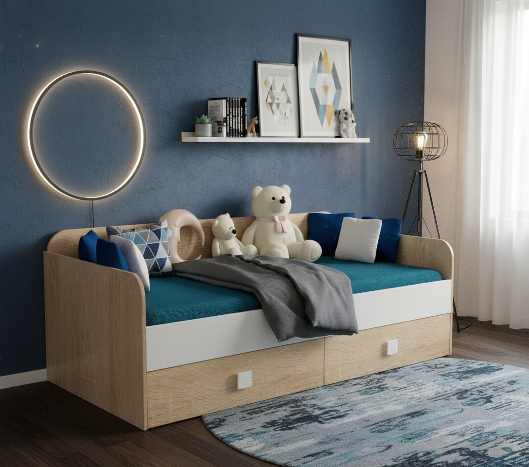 * В кровать встроены два выдвижных ящика на шариковых направляющих полного выдвижения.