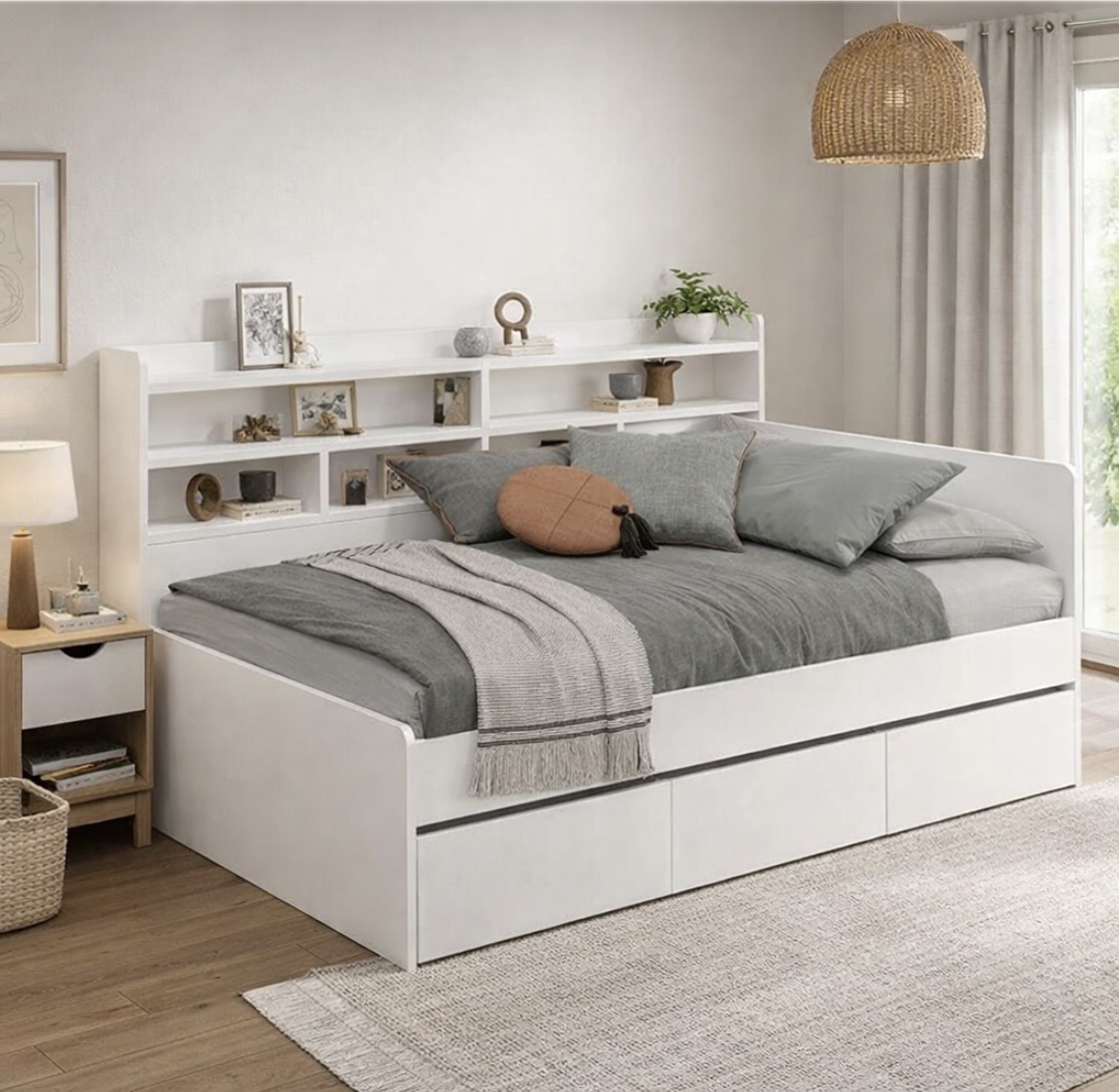 Кровать имеет 3 выдвижных ящика на шариковых направляющих, а также удобные внутренние отделения для хранения вещей.
