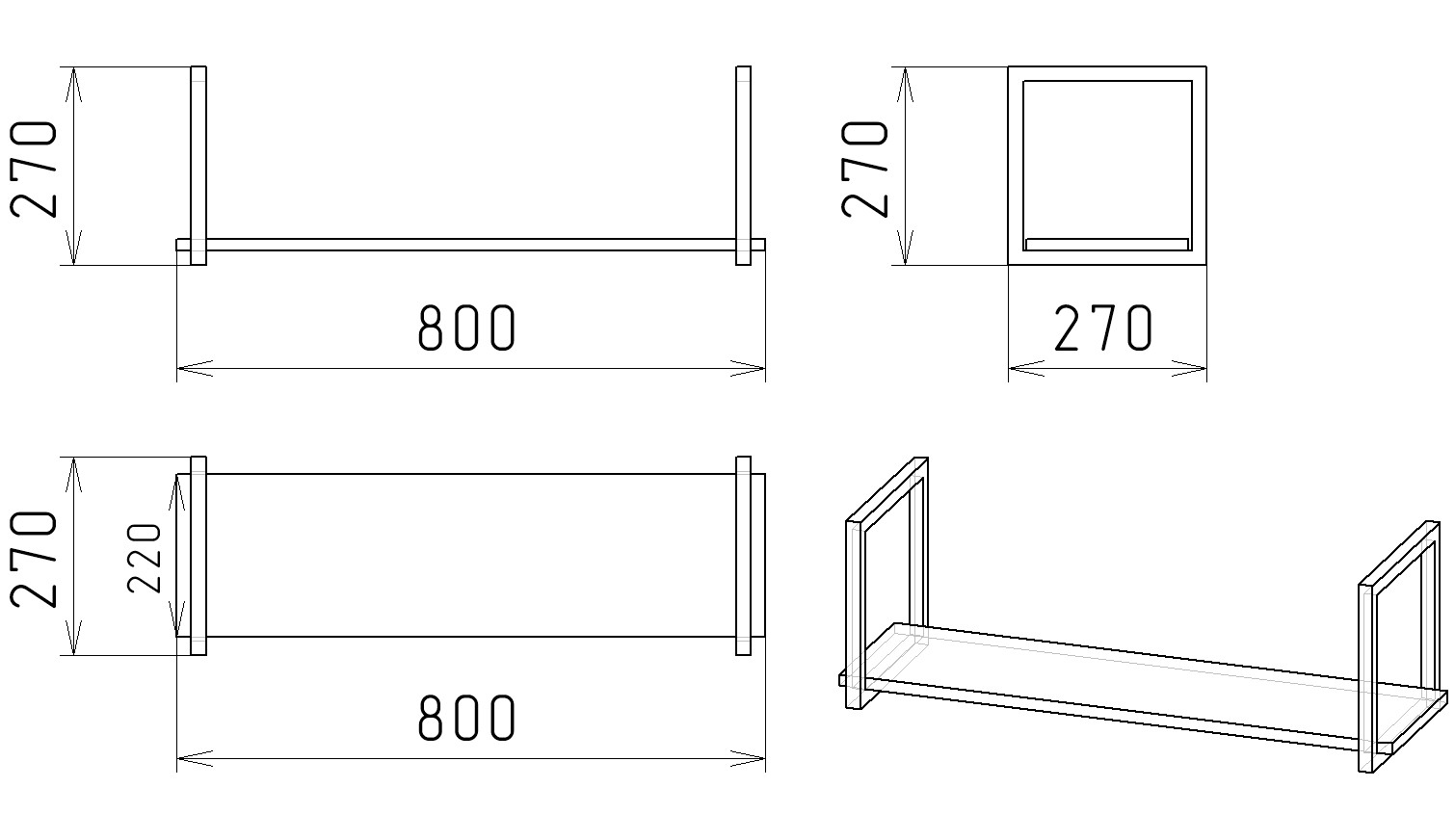 Габариты полки: ширина 800, глубина 270, высота 270 мм
