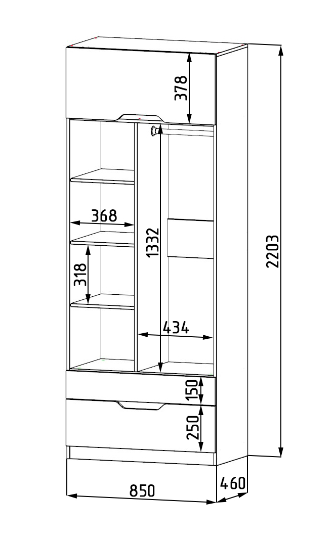 Габариты: ширина 850 х высота 2203 х глубина 479 мм
