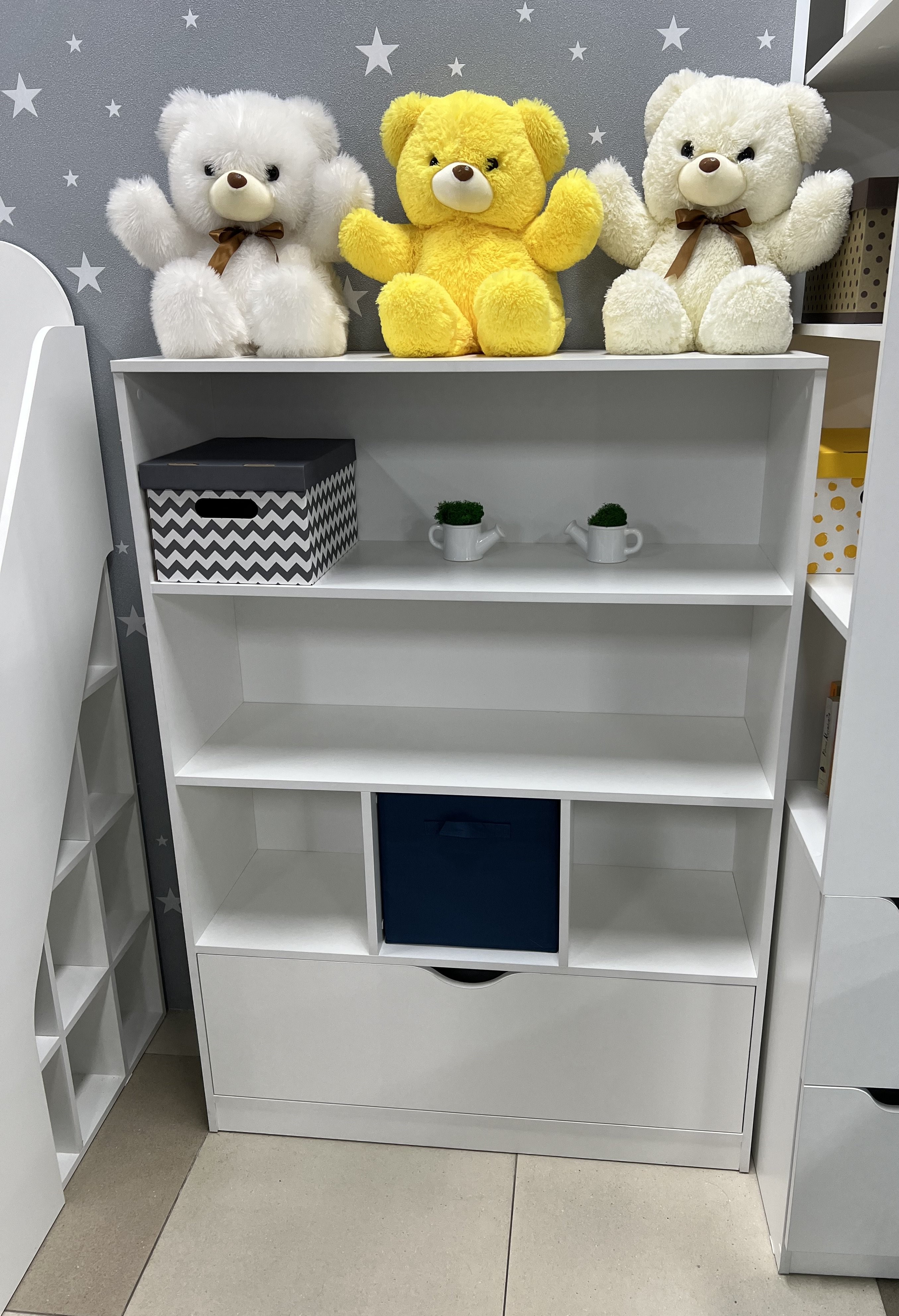 Вместительный стеллаж - практичное дополнение в интерьере детской комнаты.
